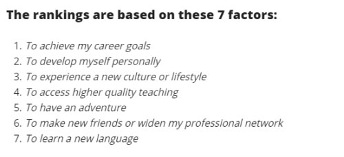 大家可以看出这份排名并不像USNEWS、QS世界大学排名等更专注于学术,而是更多的专注于学生留学的体验感,如果你更多的想享受你的留学生活,不妨来看看这个排行榜。