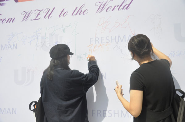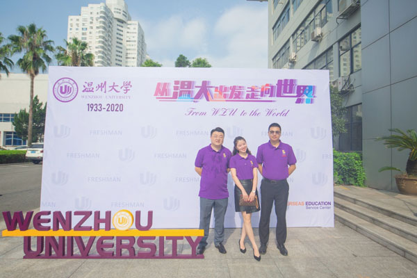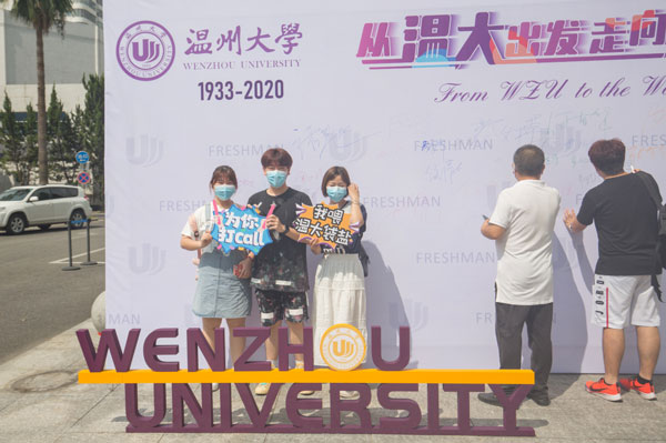 穿过学院路校区的标志——大榕树,同学们和家长纷纷在国际楼一楼门口的喷绘墙上签下自己的名字,留下珍贵的合影,这是他们在温州大学的第一笔印记,从此刻起,他们正式成为温大学子和温大学子亲属的一员。
