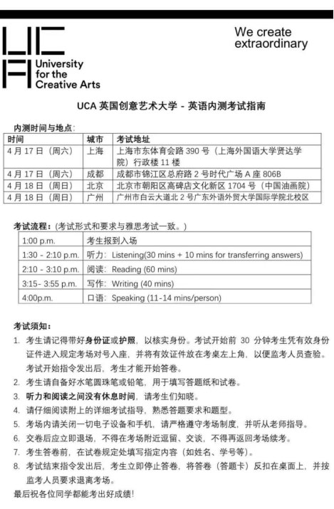 发布时间:05-08 来源:天津大学国际艺术教育中心UCA,2021年第二轮线下英语内测现开放报名啦。内测将在北京,上海,广州,成都四个城市进行,为入读语言班及秋季本科和研究生主课的同学们提供免除雅思直接入学的机会。欢迎大家报名!