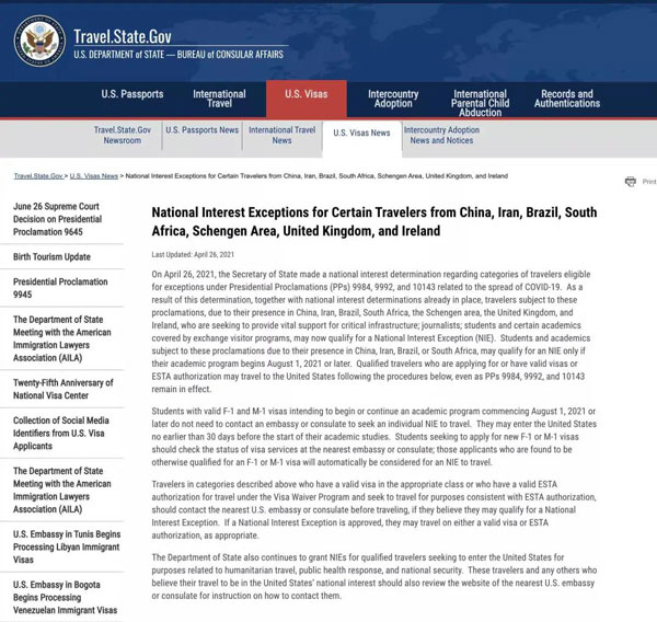 此次F/M类签证旅行限制的解除对象除了中国以外,还包括伊朗、巴西、南非、申根地区、英国和爱尔兰。