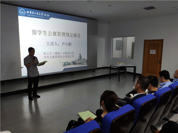 后勤保卫处学生公寓管理办公室尹小鹏副主任从住宿管理、安全管理、日常管理、房间管理和违规违纪管理,就留学生公寓管理规定作了详细说明,并介绍了留学生公寓住宿有关注意事项。