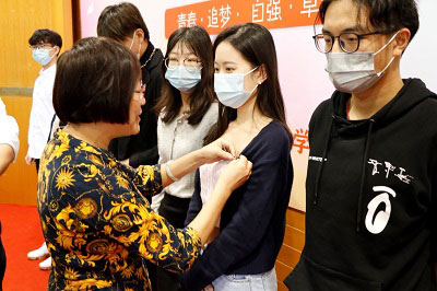 随后是佩戴校徽仪式,王海燕书记、王惠珏副院长、孙华明主任和蔡志强主任分别为新生代表佩戴校徽。