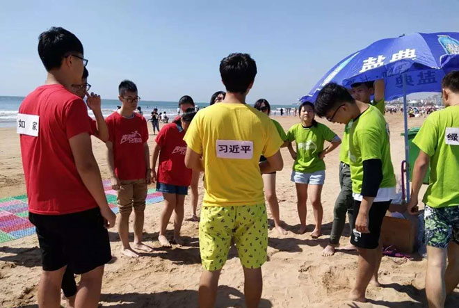 到达目的地之后,大家脱去身上的“包袱”,包、手机、手表、鞋子等统统放进这个小帐篷。九点钟,准时开始了。先分成红、黄、蓝三队,每队各一名队长。来看看队员都有谁吧!先是我们的裁判,“习大大”
