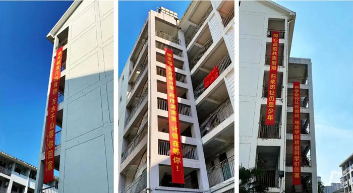 各学院一幅幅温情而又俏皮的条幅标语悬挂在宿舍楼和道路旁