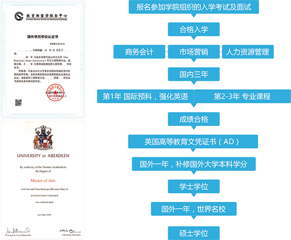 (二)可赴国外合作大学就读本科课程,按照国外大学要求修满学分即可取得毕业证书及学士学位证书。
