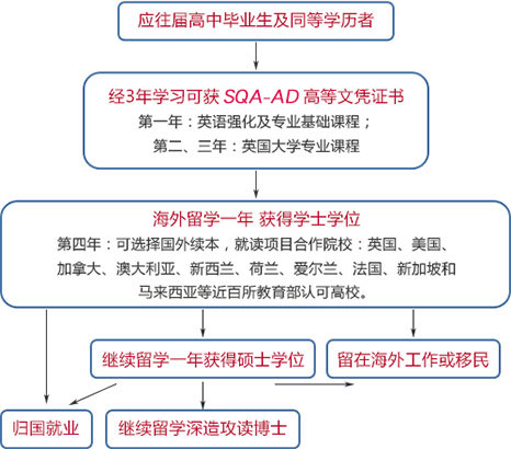 SQA-AD项目,原SQA HND,其英文全称为“CSCSE-SQA Advanced Diploma”,中文解释为英国高等教育文凭。自2019年1月1日起,由Higher National Diploma(HND)更名为Advanced Diploma(AD)。该课程凭借高质量的课程体系、先进的教学理念、灵活而又严格的教学管理体系,享誉全球。学生完成学业后,将获得具有国际水准、普遍承认的学历文凭,该文凭相当于完成了英国大学二年级的课程(英国大学本科学制通常为三年)。持有SQA-AD项目证书的学生,可以申请进入英国、美国、加拿大、澳大利亚等多个国家的大学继续深造。在完成国外大学的最后一年课程后,学生可以获得所就读大学的学士学位,并有机会继续攻读硕士学位相关课程。